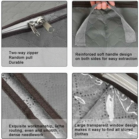 ăMatĂ©riau anti poussiĂšreăCes sacs de rangement pour vĂȘtements sont constituĂ©s de trois couches de tissu non tissĂ© Ă©pais et de PVC, solides et durables, respirants et anti poussiĂšre, tout en protĂ©geant les articles stockĂ©s de l’humiditĂ©, sans se soucier de la moisissure.