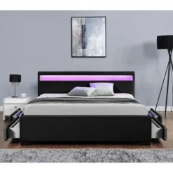 Vous manquez d’espace dans votre chambre ? La structure de lit en PU (polyuréthane) Enfield va vous surprendre par son aspect pratique ! Cette structure de lit pour adulte en 140×190 cm avec tiroirs de rangement et LED intégrées (4 couleurs disponibles pour l’ambiance de votre choix) habillera votre chambre par son design simple mais efficace et ses espaces de rangement supplémentaires.