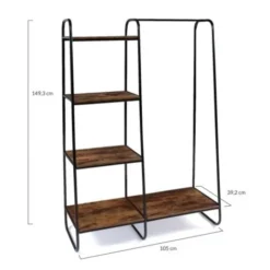 Descriptif du dressing PAOLOCraquez pour ce dressing PAOLO alliant bois vieilli et métal !Ses 4 étagères vous permettent de ranger vos habits pliés tout en profitant d’une large barre de penderie. Installez facilement vos affaires et profitez de ce rangement simple et malin ! La partie penderie de 58 CM de longueur vous permet d’entreposer plusieurs vestes et chemises. Pour optimiser votre rangement, pensez à utiliser la planche sous votre barre de penderie.Les 4 étagères espacées de 39 CM vous permettent d’entreposer vos affaires comme des plantes ou de la décoration. Voilà la solution idéale pour apporter de la modernité dans votre intérieur, tout en optant pour un dressing optimisé. Le design tendance et épuré du portant PAOLO en fait un élément parfait pour votre chambre ou votre chambre d’amis. Habillez-le de plantes, de vêtements et de boîtes de rangements. Voilà le nouvel indispensable de votre intérieur. Dimensions du dressing PAOLO- Dimensions hors tout : Longueur 105 x largeur 39.2 x Hauteur 149.3 CM- Dimensions de la partie penderie : L.58 x l.39.2 x H.149.3 CM- Dimensions de la partie étagères : L.47 x l.39.2 x H. 149.3 CM- Espace entre chaque étagère : 39 CM- Largeur décroissante des étagères : 39 – 35 – 30 – 27 CM (en partant du bas)- Structure tube métal noir 19mm et panneaux de particules 15mm- Hauteur des pieds : 14.5 CMRetrouvez l’ensemble de nos dressings sur notre boutique en ligne !