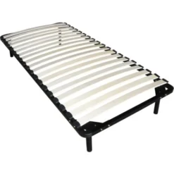 Pour les tailles 90×190 cm et 90×200 cm : 19 lattes en bois multiplis par couchage fixées par embouts PVC de protection. Lot de 4 pieds noirs cylindriques inclus.