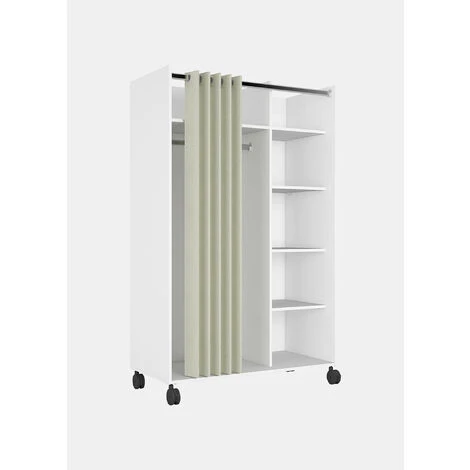 Structuré avec cinq étagères et une barre-penderie, elle peut être fermée discrètement avec un rideau en tissu déjà intégré.