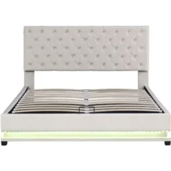 Grand espace sous le sommier à lattes relevable grâce à la barre hydraulique vous permet d’y mettre des bagages ou des boîtes de rangement.