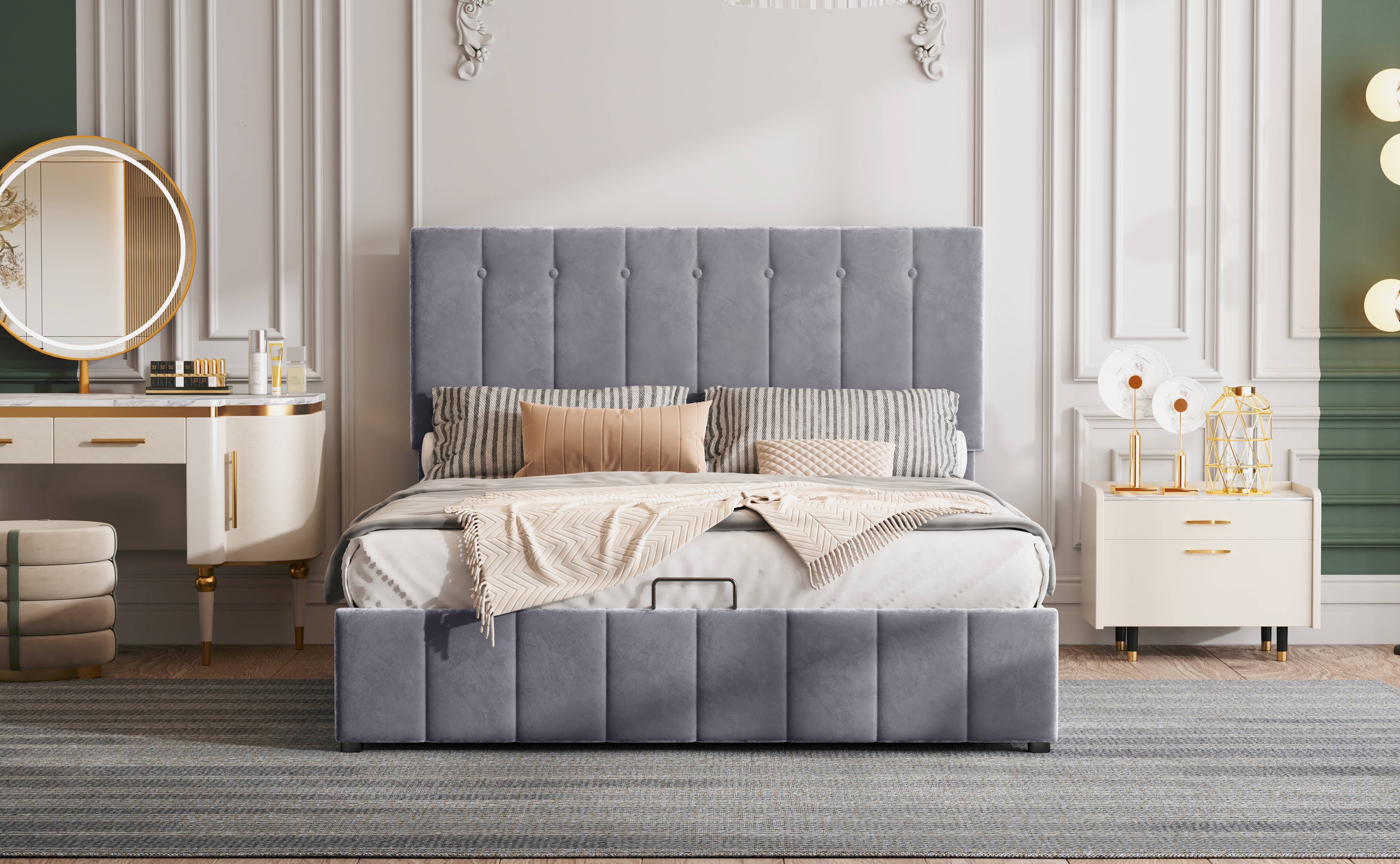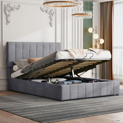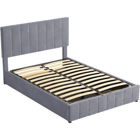 Lit coffre adulte 140 x 200 cm en velours gris, Structure en métal, Sommier à lattes inclus, Finition avec boutons, Style scandinave, Gris