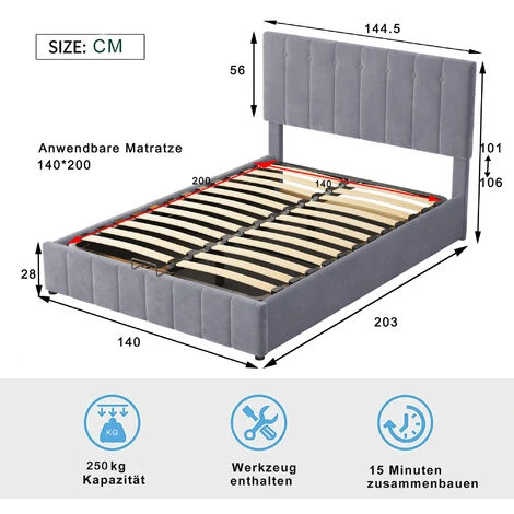 Ce magnifique lit plateforme rembourré est doté d’une tête de lit rembourrée pour ajouter un look chic et moderne à votre chambre à coucher et est rempli de mousse épaisse pour plus de confort. Structure en bois robuste et système de lattes en bois pour plus de stabilité et de sécurité. Un système de rangement hydraulique sous le matelas permet de ranger l’essentiel de votre chambre dans un espace plus petit sans sacrifier la taille de lit souhaitée. De plus, ce produit est livré avec un kit de lattes. Ne manquez pas l’occasion de l’emporter chez vous aujourd’hui.