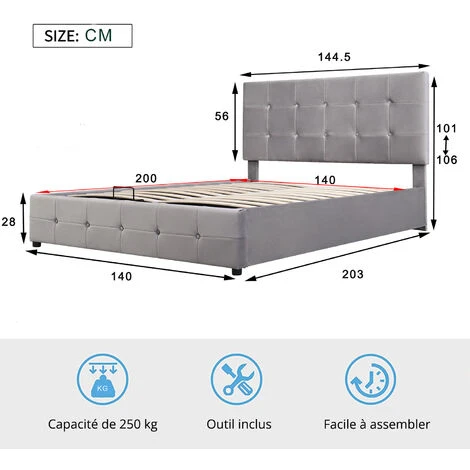 - Matelas recommandé : 140 x 200 cm, épaisseur : 12-24 cm (non inclus)