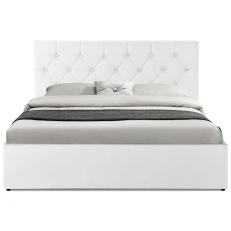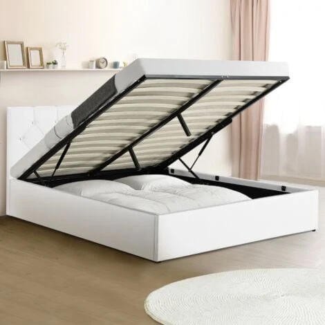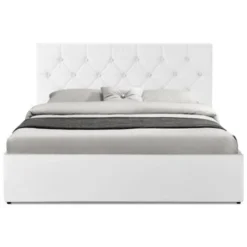 Donnez une touche contemporaine Ă votre chambre Ă coucher avec le lit coffre double avec sommier et tĂȘte de lit AUSTIN 140 x 190 CM ! Et donnez une seconde vie Ă votre espace de nuit! En plus d’avoir des finitions soignĂ©es avec son revĂȘtement polyurĂ©thane rĂ©sistant imitation cuir coloris blanc, la structure du lit, pratique et fonctionnelle, abrite sous son sommier un grand coffre de rangement. DotĂ© d’une jolie tĂȘte de lit travaillĂ©e, au capitonnage en forme de losange, celle-ci habille Ă©lĂ©gamment votre mur tout en vous apportant le confort et le soutien nĂ©cessaires Ă la qualitĂ© de votre repos et de votre sommeil.Un gain de temps et d’espace ! Fini les oreillers empilĂ©s, laissez place Ă une chambre rangĂ©e en toute circonstance avec le lit AUSTIN Ă rangement intĂ©grĂ©. Pour votre propre chambre Ă coucher ou la chambre d’amis afin de recevoir famille ou invitĂ©s dans une chambre ordonnĂ©e. Fonctionnel, vous pouvez y ranger draps, couettes, Ă©dredons, et vĂȘtements volumineux ou pourquoi pas des jeux de sociĂ©tĂ© !Le coffre, de la dimension du lit, est facile Ă ouvrir et Ă fermer en un instant : le sommier est relevable en un tour de main grĂące au mĂ©canisme de vĂ©rins de levage.Stable et robuste, dotĂ© de pieds intĂ©grĂ©s Ă la structure et d’une barre transversale sous sommier avec 2 pieds en mĂ©tal centraux.Sommier Ă 24 lattes en bois tout confort. Zone lombaire renforcĂ©e grĂące au resserrement des lattes pour garantir un confort optimal – Facilite l’aĂ©ration du matelas, et apporte flexibilitĂ© au couchage.StylĂ© et pratique Ă la fois, sa couleur passe-partout s’adapte Ă tous les intĂ©rieurs.Dimensions du lit coffre AUSTIN 140 x 190 CM- Dimensions hors tout : Longueur 201 CM x largeur 151 CM x Hauteur 89 CM environ- Dimensions tĂȘte de lit : Longueur 151 x Hauteur 87,5 x Ăpaisseur 7 CM- Hauteur du cadre de lit : 30 CM – Ăpaisseur 3,5 CM- 6 pieds : 4 en bois et 2 en mĂ©tal- Hauteur des pieds : 1,5 CM- Dimensions standard pour un matelas 140 x 190 CM 2 places- Nettoyage facile avec chiffon humide- Matelas non fourni*Produit non livrable en CorseCe modĂšle de lit AUSTIN est disponible dans d’autres coloris et d’autres dimensions :- Lit coffre AUSTIN PVC gris avec sommier 140 x 190 CM- Lit coffre AUSTIN PVC gris avec sommier 160 x 200 CM- Lit coffre AUSTIN PVC blanc avec sommier 160 x 200 CM- Lit coffre AUSTIN PVC noir avec sommier 140 x 190 CMRetrouvez l’ensemble de notre gamme de lits sur notre boutique en ligne ! – HORS CORSE -article non livrable en Corse