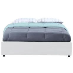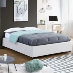 Donnez une touche contemporaine Ă votre chambre Ă coucher avec le lit coffre double avec sommier MIAMI 160 x 200 CM ! Et donnez une seconde vie Ă votre espace de nuit ! En plus d’avoir des finitions soignĂ©es avec son revĂȘtement polyurĂ©thane rĂ©sistant imitation cuir coloris blanc, la structure du lit, pratique et fonctionnelle, abrite sous son sommier un coffre de rangement.Un gain de temps et d’espace ! Fini les oreillers empilĂ©s, laissez place Ă une chambre rangĂ©e en toute circonstance avec le lit Miami Ă rangement intĂ©grĂ©. Pour votre propre chambre Ă coucher ou la chambre d’amis pour recevoir famille ou invitĂ©s dans une chambre ordonnĂ©e. Fonctionnel, vous pouvez y ranger draps, couettes, Ă©dredons, et vĂȘtements volumineux.Le coffre, de la dimension du lit, est facile Ă ouvrir et Ă fermer en un instant : le sommier est relevable en un tour de main grĂące au mĂ©canisme de vĂ©rins de levage.Stable et robuste, avec les pieds intĂ©grĂ©s Ă la structure et sa barre transversale sous sommier avec 2 pieds mĂ©tal centraux.Sommier Ă 24 lattes en bois tout confort. Zone lombaire renforcĂ©e grĂące au resserrement des lattes pour garantir un confort optimal – Facilite l’aĂ©ration du matelas, et apporte flexibilitĂ© au couchage.StylĂ© et pratique Ă la fois, sa couleur passe-partout s’adapte Ă tous les intĂ©rieurs.Dimensions du lit MIAMI avec coffre de rangement- Dimensions totales hors tout : Longueur 216 x largeur 173 x Hauteur 34,5 CM- Hauteur cadre de lit : 34,5 CM- Dimensions standard pour un matelas 160 x 200 CM 2 places- Nettoyage facile avec chiffon humide- Matelas non fourniNombre de colis :Carton 1 : 176 x 14,5 x 38 CM – poids 14 kgCarton 2 : 222 x 9,5 x 35 CM – poids 13 kgCarton 3 : 195,5 x 11 x 26 CM – poids 22 kg*Produit non livrable en CorseCe modĂšle de lit MIAMI est disponible dans d’autres coloris et d’autres dimensions :- Lit coffre double MIAMI avec sommier 140 x 190 CM PVC blanc- Lit coffre double MIAMI avec sommier 140 x 190 CM PVC gris- Lit coffre double MIAMI avec sommier 160 x 200 CM PVC grisRetrouvez l’ensemble de notre gamme de lits sur notre boutique en ligne ! – HORS CORSE -article non livrable en Corse