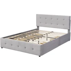 【Lit avec tiroirs】Ce cadre de lit en tissu comprend 4 tiroirs à roulettes lisses, parfaits pour ranger des bric-à-brac supplémentaires. Espace de rangement supplémentaire pour un rangement facile