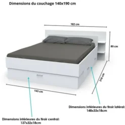 Lit SAMBA 140x190cm + tête de lit étagère + 2 tiroirs de rangement