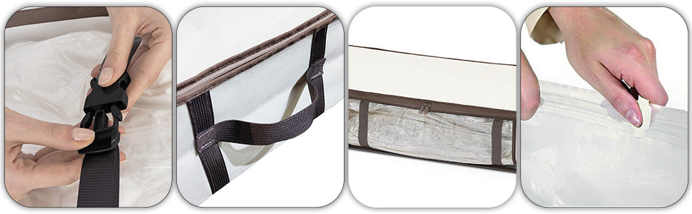 - GRANDE OUVERTURE POUR RANGEMENT FACILE : Avec une grande ouverture au haut des rangements, il vous sera facile dâouvrir totalement les housses et faciliter lâinsertion des sacs sous vides bien remplis ou tout simplement de vĂȘtements ou autres non compressĂ© selon votre usage. De plus, les attaches intĂ©rieures vous permettra un meilleur maintien de la compression et les anses sur les cĂŽtĂ©s vous permettront de mieux dĂ©placer les housses.
