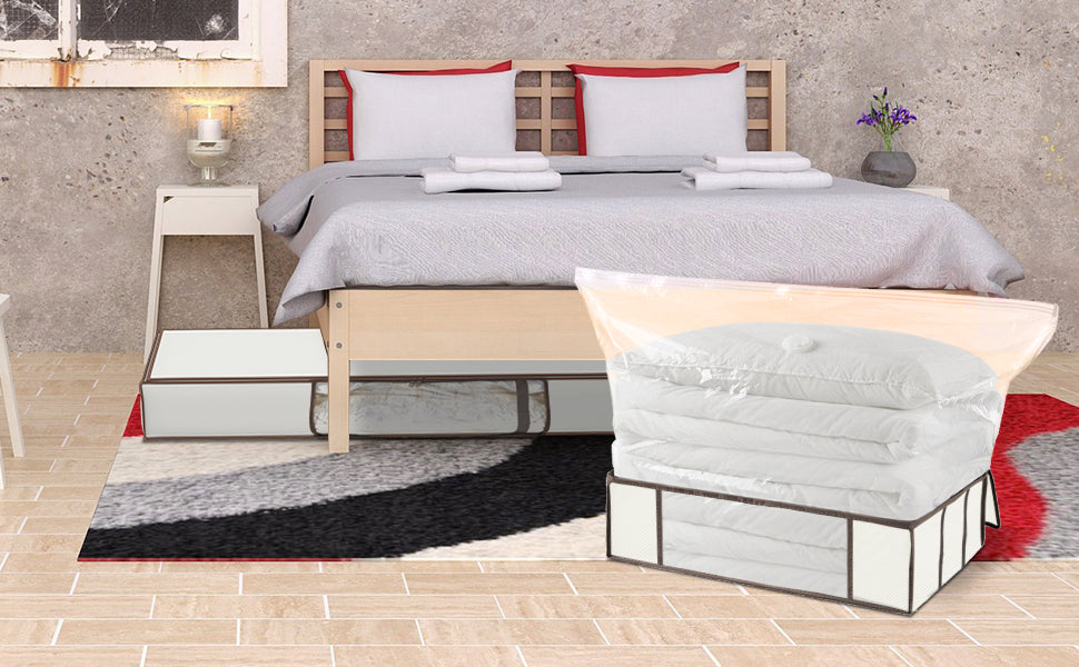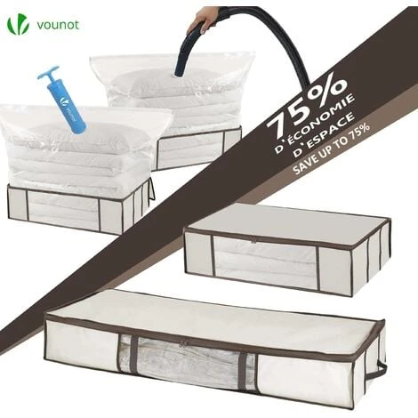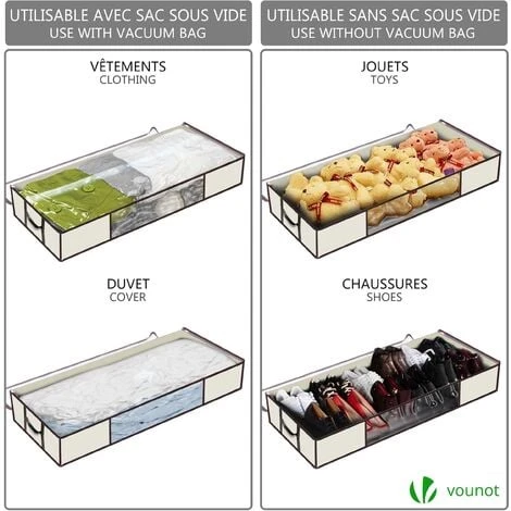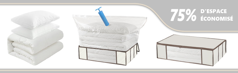 - ĂCONOMISEZ 75% DE PLACE DANS VOTRE PLACARD : Nos housses de rangement vous permettent de compartimenter vos vĂȘtements, duvets ou autres grĂące Ă 2 tailles pratiques qui permettent un emplacement aussi bien sous le lit que dans les placards. Ă cela sâajoute les sacs sous vide vous permettant de compresser un maximum vos affaires.