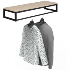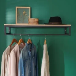 Chic et pratique, la penderie étagère murale GRIF vous permettra de ranger vos affaires et de suspendre vos vestes et blousons sur des cintres en apportant une touche déco ! La tablette est fabriquée à partir de panneaux de particules mélaminés (PPM) et se combine parfaitement avec la structure en métal noir.