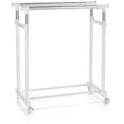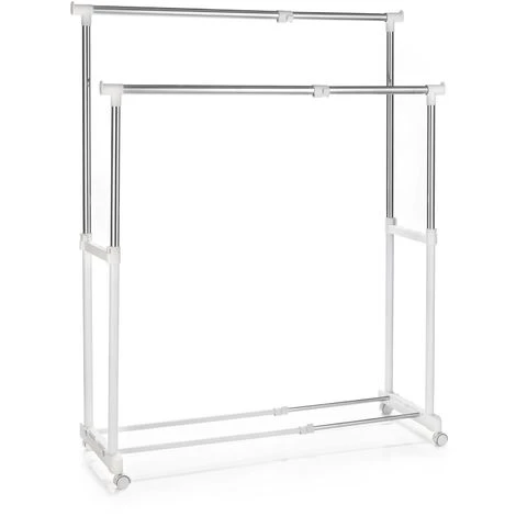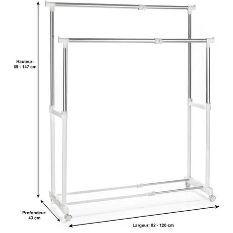 … est idéal comme accessoire complémentaire pour le rangement de vos vêtements. Vous pouvez ainsi profiter de 2 tringles réglables en hauteur indépendamment l’une de l’autre, et agrandir ou réduire en longueur cette penderie selon l’espace disponible dans la pièce. Même quelques chaussures peuvent être stockées sur les barres du bas. Cette penderie est le compagnon parfait dans votre chambre, votre dressing ou votre entrée, très facile à déplacer avec ses roulettes.