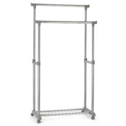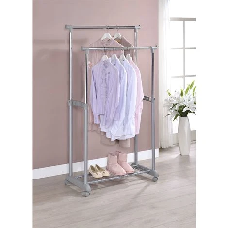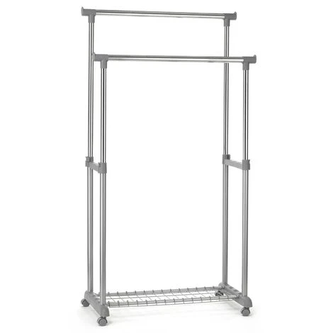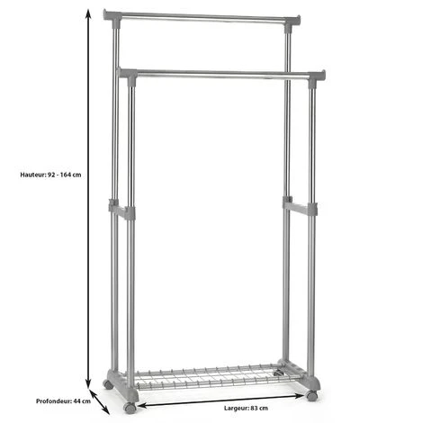 … dispose de deux tringles à vêtements ce qui vous fera gagner un espace précieux pour suspendre tous vos manteaux et vos vestes, mais aussi des robes et des chemisiers. La tablette basse vous permettra également d’entreposer vos sacs ou quelques paires de chaussures. Monté sur 4 roulettes robustes, ce portant se déplacera à votre gré grâce à son design rectiligne et discret et trouvera sa place aussi bien dans votre chambre que dans un dressing ou dans votre couloir.