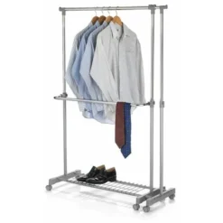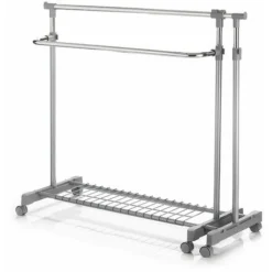 – Le portant à vêtements sur roulettes se compose de tubes métalliques chromés et d’un revêtement robuste en plastique gris.