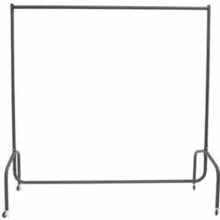 – Le portant à vêtements sur roulettes se compose de tubes métalliques chromés et d’un revêtement robuste en plastique gris.