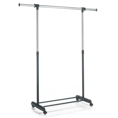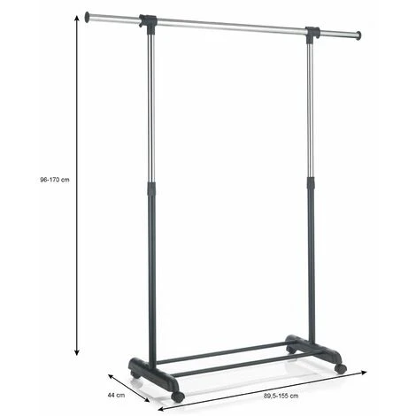 … est idéal comme accessoire complémentaire pour le rangement de vos vêtements. Vous pouvez ainsi profiter d’une tringle extensible et agrandir ou réduire en hauteur cette penderie selon l’espace disponible dans la pièce. Même quelques chaussures peuvent être stockées sur les barres du bas. Cette penderie est le compagnon parfait dans votre chambre, votre dressing ou votre entrée, très facile à déplacer avec ses roulettes.