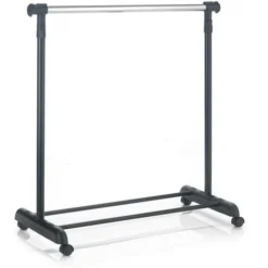 – Ce portant à vêtements sur roulettes se compose de tubes métalliques chromés et laqués noir et d’élements robustes en plastique de coloris noir.
