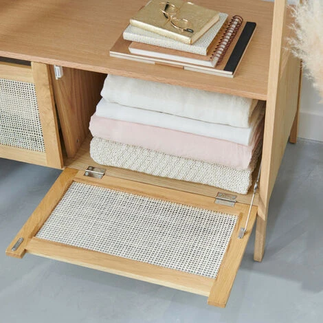 Son look original et ses matĂ©riaux nature en font un alliĂ© pour un intĂ©rieur rangĂ© et stylĂ©. Il a Ă©tĂ© pensĂ© pour supporter une charge maximale de 30 kg. FabriquĂ© Ă partir de chĂȘne massif, d’acacia et de medium (MDF), il possĂšde aussi deux placards de rangement fermĂ©s en cannage naturel de rotin avec des portes basculantes.