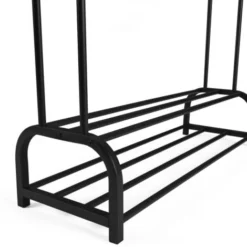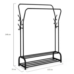 Idéal dans une chambre ou une buanderie, ce meuble est conçu pour accrocher tous types de vêtements qu’ils soient courts ou longs. Ce portant industriel est doté de plusieurs espaces de rangement : 2 barres de penderie pouvant supporter 15 Kg chacune, 6 crochets doubles et 2 étagères.Ultra fonctionnelle, cette penderie de 115 CM de longueur vous offre une grande capacité de rangement grâce à son système de double barres de penderie. Servez-vous des deux étagères du bas pour augmenter vos possibilités de rangement en y stockant des chaussures ou des boîtes. Rangez rapidement et facilement vos manteaux, robes, vestes et accessoires avec ce joli portant à vêtements en métal noir et sa double penderie XXL. Esthétique, ses lignes épurées, sa finition métal noir et son design industriel apportent un côté chic et moderne à votre pièce. Fabriqué à partir d’une structure en métal, le vestiaire double PAULE est stable et robuste. Pour vous garantir une stabilité à toute épreuve, le portant à vêtements est muni de 4 patins antidérapants. Mettez de l’ordre dans vos affaires grâce à ce portant à vêtements double penderie PAULE en métal noir ! Dimensions du portant à vêtements- Dimensions totales hors tout : Longueur 115 CM x largeur 35 CM x Hauteur 148 CM- Dimensions rangement chaussures : L. 115 x l. 35 x H. 25 CM- Livré avec 6 crochets doubles- 4 patins antidérapants fournis- Capacité du portant : 15 Kg par barre- Capacité du range-chaussures : 20 KG- Capacité du crochet : 3 KG- Matériau : métal, épaisseurs tubes de 19 MM et 25 MM- À monter soi-mêmeRetrouvez tous nos portants et meubles d’entrée sur notre boutique en ligne.