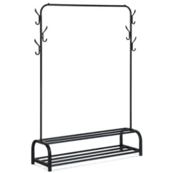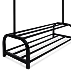 Facilitez le rangement de vos manteaux, robes, vestes et accessoires avec ce joli portant à vêtements en métal noir. Esthétique, ce portant à vêtements présente un style industriel moderne, avec sa finition métal noir. Ses lignes épurées et son design industriel apportent un côté chic et moderne à votre pièce. Pratique et fonctionnel, ce portant au design industriel est doté de plusieurs espaces de rangement : crochets doubles et étagères. Idéal dans une chambre, une buanderie, un dressing, ce meuble est conçu pour accrocher tous types de vêtements qu’ils soient courts ou longs. Ses deux étagères du bas permettent de ranger des chaussures, des boîtes, des paniers et ainsi d’augmenter les possibilités de rangement. Stable et robuste, le vestiaire PAULE 150 cm est fabriqué à partir d’une structure en métal (épaisseur des tubes carrés 2,5 cm x 0,55 cm). Muni de 4 patins antidérapants pour vous garantir une stabilité à toute épreuve. Décorez votre intérieur avec goût en choisissant ce joli portant à vêtements en métal noir PAULE ! Dimensions du portant à vêtements- Dimensions totales hors tout : Longueur 115 CM x largeur 35 CM x Hauteur 150 CM- Dimensions rangement chaussures : L. 115 x l. 35 x H. 25 CM- Livré avec 6 crochets doubles- 4 patins antidérapants fournis- Capacité du portant : 15 KG- Capacité du range-chaussures : 20 KG- Capacité du crochet : 3 KG- Matériau : métal, épaisseurs tubes de 19 MM et 25 MM- À monter soi-mêmeRetrouvez tous nos portants et meubles d’entrée sur notre boutique en ligne.