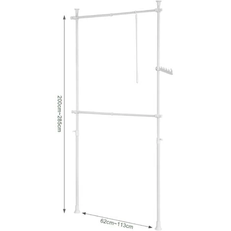 Se monte simplement entre le sol et le plafond, sans percer ! Deux barres porte-vêtements télescopique et extensible, de 77-112cm en largeur, et de 103-278cm en hauteur.La position des barres est réglable. Montage et démontage rapide et facile.