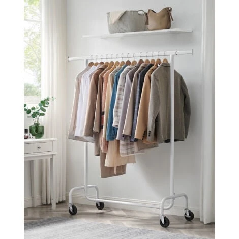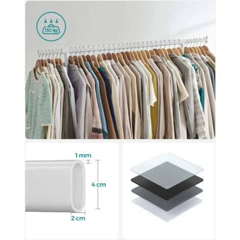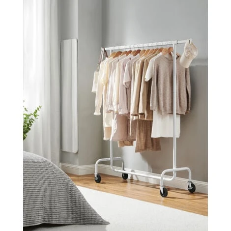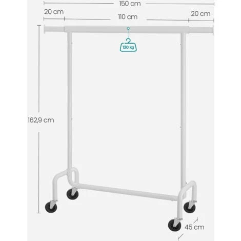 Facile à déplacerLes 4 roulettes pivotantes à 360° vous permettent de le déplacer facilement | RobusteGrâce à la tringle en acier épais, pas de problème pour 70 vêtements | ExtensibleAllongez la barre de 110 à 150 cm pour plus d’espace de suspension |