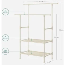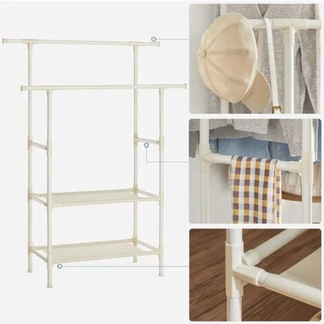 Pour des matins plus calmes : Le matin, vous perdez combien de temps à choisir et à assortir vos vêtements ? Il est grand temps d’opter pour ce porte-manteau blanc pratique ! Les 2 barres de suspension robustes et une étagère à 2 niveaux vont vous simplifier la vie ! Avec ce portant, profitez-en pour mettre de l’ordre dans vos chemises, vos robes, vos manteaux, vos sacs et même vos chaussures. Assortissez tout à l’avance pour mieux commencer la journée !