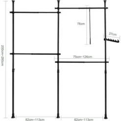 SoBuy KLS03-Sch Télescope Porte-Vêtements Système de Penderie Télescopique La variable télescopique armoire offre beaucoup de place et a sa place dans n’importe quelle chambre. Idéale de le placer à l’entrée, dans une chambre, dans un bureau, ou encore dans un studio. Rêve de penderie accessible, offrant beaucoup de place pour les robes, les manteaux, les corsages, les pantalons ou les chemises. Offre beaucoup de place et a sa place dans n’importe quelle chambre. Se monte simplement entre le sol et le plafond, sans percer ! 4 barres porte-vêtements télescopique et extensible en largeur de 74-122cm. 4 poteaux réglables en hauteur de 200-270cm. La position des barres est ajustable. Montage et démontage rapide et facile. Détails: – Matériel: tube et panier en Acier inoxydable et accessoires en plastique. – Capacité de charge total jusqu’à 25 kg. – Poids de l’envoi : 6 kg. Les éléments de décoration ne sont pas inclus dans la livraison. Livraison : penderie, notice de montage détaillée. Avec la notice de montage illustrée et les pièces numérotées, le montage est facile. Facture fournie.