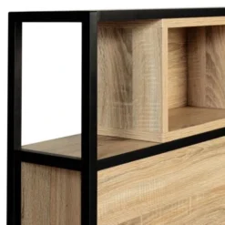 Simple et moderne, avec son design sobre et Ă©purĂ©, la tĂȘte de lit DETROIT s’intĂ©grera parfaitement Ă votre chambre Ă coucher !Le contraste esthĂ©tique entre la couleur bois de la structure et le coloris noir du mĂ©tal habillera joliment votre lit avec Ă©lĂ©gance et modernitĂ©.Astucieuses et fonctionnelles, ses niches supĂ©rieures et latĂ©rales vous permettront d’organiser le rangement de vos affaires personnelles pour une chambre dĂ©gagĂ©e et zen en toutes circonstances. Pratiques et dĂ©co, rangez-y votre montre, livre de chevet, rĂ©veil, pilulier, produits de nuit, sans avoir Ă vous relever !Stables et robustes, ses pieds contemporains en mĂ©tal noir lui confĂšrent une allure brute esprit factory. Compatible avec les lits 140 cm, cette tĂȘte de lit ne nĂ©cessite pas de fixation murale et peut donc ĂȘtre installĂ©e partout et facilement, un atout supplĂ©mentaire pour cette tĂȘte de lit au style unique !Conçus pour apporter une touche de modernitĂ© aux petits comme aux plus grands espaces.Dimensions de la tĂȘte de lit DETROIT- Dimensions totales hors tout : Longueur 145 CM x largeur 20 CM x Hauteur 120 CM- Dimensions des 2 niches supĂ©rieures : Longueur 40 x Profondeur 19 x Hauteur 24 CM- Dimensions des niches latĂ©rales : Longueur 16 x Profondeur 25 x Hauteur 45 CM- Hauteur par rapport au sol : 45 CM- Ă monter soi-mĂȘmeCe modĂšle existe aussi en bois et mĂ©tal blanc.Retrouvez Ă©galement le format pour lit 160 CM ainsi que l’ensemble de notre collection industrielle sur notre boutique en ligne.