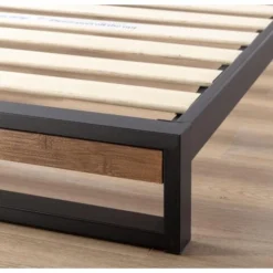Ce cadre de lit bien conçu avec sa tête de lit en bois naturel massif et sa base en acier noir robuste est parfait pour une chambre à coucher moderne. La combinaison du cadre en acier et du solide sommier en bois offre un remarquable support qui aide à prolonger la durée de vie de votre matelas. Nous avons également ajouté une bande antidérapante sur les lattes afin d’empêcher votre lit de grincer et de maintenir votre matelas en place. Ce lit a été conçu pour être facile à monter. Il est livré à votre porte dans une seule boîte où se trouvent tous les outils et instructions nécessaires.