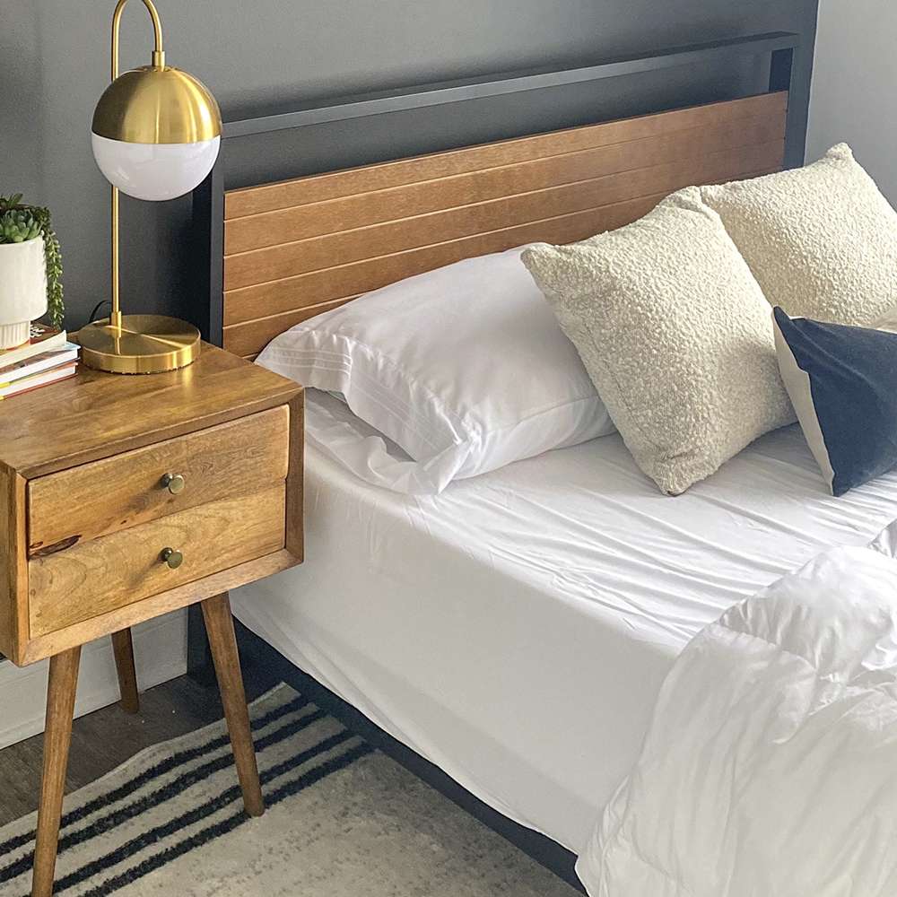 Ce cadre de lit bien conçu avec sa tête de lit en bois naturel massif et sa base en acier noir robuste est parfait pour une chambre à coucher moderne. La combinaison du cadre en acier et du solide sommier en bois offre un remarquable support qui aide à prolonger la durée de vie de votre matelas. Nous avons également ajouté une bande antidérapante sur les lattes afin d’empêcher votre lit de grincer et de maintenir votre matelas en place. Ce lit a été conçu pour être facile à monter. Il est livré à votre porte dans une seule boîte où se trouvent tous les outils et instructions nécessaires.